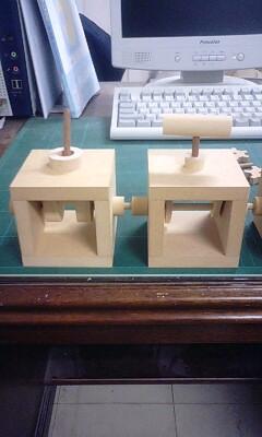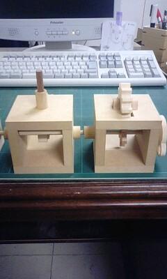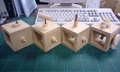 まずはペーパークラフトの第一人者、世界的にも名を馳せつつある坂 啓典(けいすけ)さんの「からくりの素」を、木製機素として製作中。