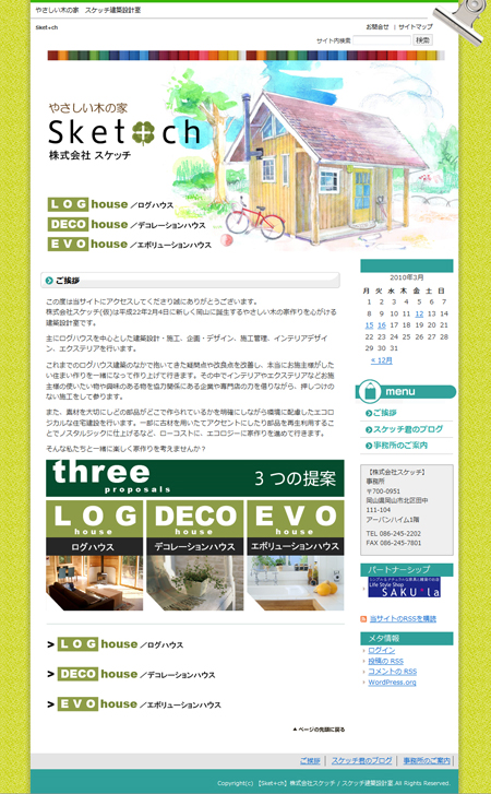 Sket+chさんの紹介2 報 2010年03月20日 友人である図子さんと仲間たちが立ち上げた、岡山市の設計室「Sket+ch」このたび、HPのデザインワークのお手伝いをさせていただきました。スケッチHPトップサイトアドレスhttp://www.sketch-arc.com/社名の「スケッチ」は、素描という意味で、夢の家を思い描くという意味があるのだと思います。とても素朴で飾らない、代表:図子さんのお人柄が現れた社名だと思います。また、助っ人+ch・・・お客様が思い描く理想の家の完成をお手伝いする・・・という深読みもできて面白いな~と♪ぜひ遊びにいってみてくださいね。 関野絡繰堂 公式HP/http://sdratm.jimdo.com/ 展覧会+ワークショップ情報/http://sdr.blog.shinobi.jp/Entry/98/ 関野絡繰堂Yahoo!店/ https://store.shopping.yahoo.co.jp/skdy/ 関野絡繰堂BASE店/ http://sdr.base.ec/ 関野絡繰堂minne店/ https://minne.com/sdr 関野絡繰堂Amazon店/ http://www.amazon.co.jp/(関野絡繰堂で検索) 関野絡繰堂Pinkoi店/ https://jp.pinkoi.com/store/sekino 関野絡繰堂メルカリ店/ https://mercari-shops.com/shops/rhPSvVgTw8RPBKCmLa4tTL 常設展示・取り扱い店情報/http://sdr.blog.shinobi.jp/Entry/355/ カラクリ 絡繰 オートマタ AUTOMATA 組木 ペットの振り子時計 PR http://sdr.blog.shinobi.jp/Entry/138/Sket+chさんの紹介2