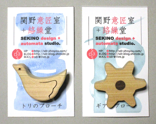 木製ブローチ 創 2010年05月07日 久々の新作「木製ブローチ」の第一弾と第二弾。トリのブローチ、ギアのブローチ。 各600円続々と、クマのブローチ、サカナのブローチも作る予定。お楽しみに♪・・・・・・・・・・・・・・・・・・・・・・・・・・・・・・・・・・・・・・5月中旬より、西粟倉・森の学校内、元・保健室の「関野意匠室+絡繰堂 展示室」にて販売します。7月17日より、同施設内売店でも販売開始予定ですので、気になる方はチェックしてください。・・・・・・・・・・・・・・・・・・・・・・・・・・・・・・・・・・・・・・先日のミニ縁日で嫁が描いた水彩画数点。 関野絡繰堂 公式HP/http://sdratm.jimdo.com/ 展覧会+ワークショップ情報/http://sdr.blog.shinobi.jp/Entry/98/ 関野絡繰堂Yahoo!店/ https://store.shopping.yahoo.co.jp/skdy/ 関野絡繰堂BASE店/ http://sdr.base.ec/ 関野絡繰堂minne店/ https://minne.com/sdr 関野絡繰堂Amazon店/ http://www.amazon.co.jp/(関野絡繰堂で検索) 関野絡繰堂Pinkoi店/ https://jp.pinkoi.com/store/sekino 関野絡繰堂メルカリ店/ https://mercari-shops.com/shops/rhPSvVgTw8RPBKCmLa4tTL 常設展示・取り扱い店情報/http://sdr.blog.shinobi.jp/Entry/355/ カラクリ 絡繰 オートマタ AUTOMATA 組木 ペットの振り子時計 PR http://sdr.blog.shinobi.jp/Entry/167/木製ブローチ