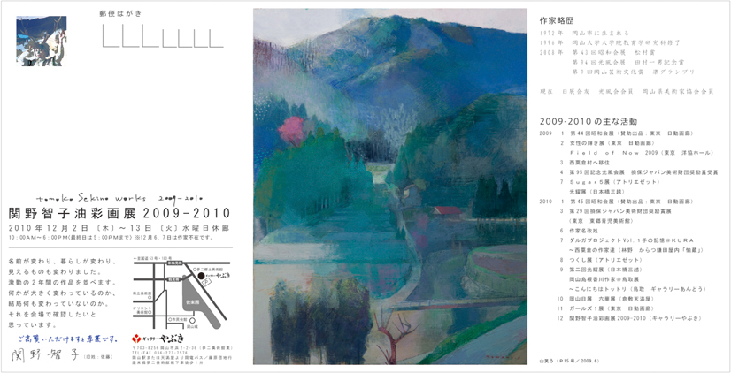 関野智子油彩画展DM 想 2010年10月10日 「関野智子油彩画展2009-2010」2010年12月2日〔木〕~13日〔火〕水曜日休廊10:00AM~6:00PM(最終日は5:00PMまで)※12月6,7日は作家不在です。DMが先ほど完成しました。これ、Z型という圧着ハガキで、折りただんだ状態はハガキサイズ。で、この画像は開いた状態です。お手元に届いた方に「え?ハガキでこの大きさ!?」と、驚いてもらえれば幸い♪デザイン:関野意匠室関野智子web http://ameblo.jp/tomoko-sato/ 関野絡繰堂 公式HP/http://sdratm.jimdo.com/ 展覧会+ワークショップ情報/http://sdr.blog.shinobi.jp/Entry/98/ 関野絡繰堂Yahoo!店/ https://store.shopping.yahoo.co.jp/skdy/ 関野絡繰堂BASE店/ http://sdr.base.ec/ 関野絡繰堂minne店/ https://minne.com/sdr 関野絡繰堂Amazon店/ http://www.amazon.co.jp/(関野絡繰堂で検索) 関野絡繰堂Pinkoi店/ https://jp.pinkoi.com/store/sekino 関野絡繰堂メルカリ店/ https://mercari-shops.com/shops/rhPSvVgTw8RPBKCmLa4tTL 常設展示・取り扱い店情報/http://sdr.blog.shinobi.jp/Entry/355/ カラクリ 絡繰 オートマタ AUTOMATA 組木 ペットの振り子時計 PR http://sdr.blog.shinobi.jp/Entry/208/関野智子油彩画展DM