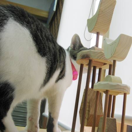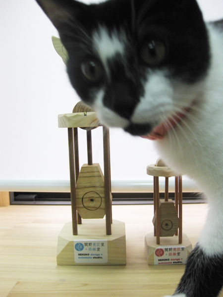 振り子鳥ミニ 創 2010年10月22日 こんにちは。今日は猫たちに新作のレポートをしてもらいます。やたらと写真がでかいですが、まぁ気にせず。市松:なんか新しいの出来たって。どこ?楓:なあに?市松:これ・・・かな?なんか鳥のアレな。市松:ちっこいのは初めて見たな。んで、よいこら、そこ通りますよっと。楓:これ?なにこれ?なんか・・・くさい・・・(注:クサくありません。ビーズワックスです。)楓:やっぱ女子的、厳しいチェック。後ろからも見とかなきゃだわ。 市松:ぬーん。最後までまともに物撮りさせてくれませんでしたが(笑)関野絡繰堂オリジナル作品「振り子鳥」のミニサイズ、出来ました。サイズ:高さ180×幅52×奥行52 使用素材:(木材)ヒノキ・ミズナラ・マホガニー (金属)真鍮・銅展示+ワークショップ情報/Exhibition+W.S. スケジュールhttp://sdr.blog.shinobi.jp/Entry/98/ 関野絡繰堂 公式HP/http://sdratm.jimdo.com/ 展覧会+ワークショップ情報/http://sdr.blog.shinobi.jp/Entry/98/ 関野絡繰堂Yahoo!店/ https://store.shopping.yahoo.co.jp/skdy/ 関野絡繰堂BASE店/ http://sdr.base.ec/ 関野絡繰堂minne店/ https://minne.com/sdr 関野絡繰堂Amazon店/ http://www.amazon.co.jp/(関野絡繰堂で検索) 関野絡繰堂Pinkoi店/ https://jp.pinkoi.com/store/sekino 関野絡繰堂メルカリ店/ https://mercari-shops.com/shops/rhPSvVgTw8RPBKCmLa4tTL 常設展示・取り扱い店情報/http://sdr.blog.shinobi.jp/Entry/355/ カラクリ 絡繰 オートマタ AUTOMATA 組木 ペットの振り子時計 PR http://sdr.blog.shinobi.jp/Entry/210/振り子鳥ミニ