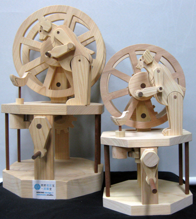水車クマ80%バージョン完成 想 2010年11月29日 今回は動画が2本。登場する猫が違うんです!(笑)写真。既存の100%バージョンと大きさ比較。この作品、ある公募展に出品します。丸ビルホール(東京駅丸の内口)にて、2011年3月5日~13日(日)に展示される予定。・・・って、まだ概要が届いてないので書いていいのかどうなのか(笑)まっ、まぁ、展示してもらえると信じている現在、この瞬間。って感じで。…[結果発表]…本日、結果が通知されました。残念ながら《選外》でした。くぅ~。悔しいけど、これをバネにがんばります♪展示+ワークショップ情報/Exhibition+W.S. スケジュールhttp://sdr.blog.shinobi.jp/Entry/98/ 関野絡繰堂 公式HP/http://sdratm.jimdo.com/ 展覧会+ワークショップ情報/http://sdr.blog.shinobi.jp/Entry/98/ 関野絡繰堂Yahoo!店/ https://store.shopping.yahoo.co.jp/skdy/ 関野絡繰堂BASE店/ http://sdr.base.ec/ 関野絡繰堂minne店/ https://minne.com/sdr 関野絡繰堂Amazon店/ http://www.amazon.co.jp/(関野絡繰堂で検索) 関野絡繰堂Pinkoi店/ https://jp.pinkoi.com/store/sekino 関野絡繰堂メルカリ店/ https://mercari-shops.com/shops/rhPSvVgTw8RPBKCmLa4tTL 常設展示・取り扱い店情報/http://sdr.blog.shinobi.jp/Entry/355/ カラクリ 絡繰 オートマタ AUTOMATA 組木 ペットの振り子時計 PR http://sdr.blog.shinobi.jp/Entry/214/水車クマ80%バージョン完成