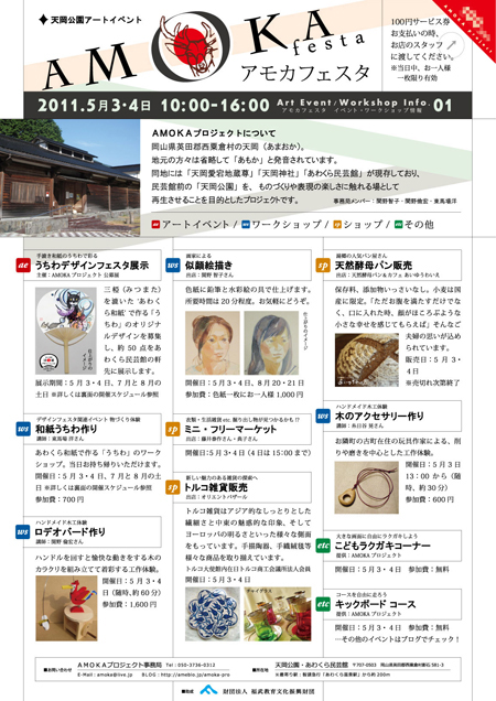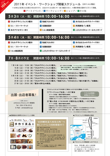 AMOKフライヤー完成 創 2011年04月07日 進捗状況。先ほど完成。明日、関係各位に確認を取ってから入稿となります。うちわフェスタの展示、和紙うちわ・木工作・似顔絵のワークショップ、ミニフリマ、トルコ雑貨、地元のパン屋さんetc.また、自由にラクガキ出来るスペースの準備や、コースをキックボードで走る遊び場も用意してお待ちしています。>JPGデータのダウンロード「AMOKAフライヤー表面」「AMOKAフライヤー表面」※ご注意!今回のフライヤーには、表面右上に三角形の「100円サービス券」が付いています。5月3・4日のアモカフェスタ会場にて、ワークショップやお買い物の際に使用可能です。なお、AMOKAプロジェクトが配布するフライヤー(印刷物)のみ有効で、個人でコピー、またはプリントアウトされたものは無効です。展示+ワークショップ情報/Exhibition+W.S. スケジュールhttp://sdr.blog.shinobi.jp/Entry/98/AMOKAプロジェクトBLOGhttp://ameblo.jp/amoka-pro 関野絡繰堂 公式HP/http://sdratm.jimdo.com/ 展覧会+ワークショップ情報/http://sdr.blog.shinobi.jp/Entry/98/ 関野絡繰堂Yahoo!店/ https://store.shopping.yahoo.co.jp/skdy/ 関野絡繰堂BASE店/ http://sdr.base.ec/ 関野絡繰堂minne店/ https://minne.com/sdr 関野絡繰堂Amazon店/ http://www.amazon.co.jp/(関野絡繰堂で検索) 関野絡繰堂Pinkoi店/ https://jp.pinkoi.com/store/sekino 関野絡繰堂メルカリ店/ https://mercari-shops.com/shops/rhPSvVgTw8RPBKCmLa4tTL 常設展示・取り扱い店情報/http://sdr.blog.shinobi.jp/Entry/355/ カラクリ 絡繰 オートマタ AUTOMATA 組木 ペットの振り子時計 PR http://sdr.blog.shinobi.jp/Entry/233/AMOKフライヤー完成