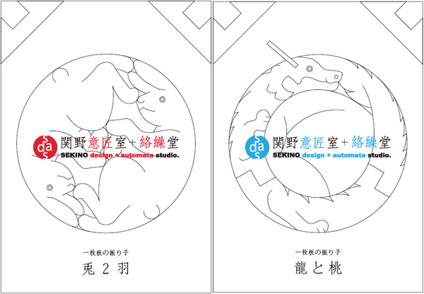 脚やオブジェを支える部品も含めて一枚板から作る造形は、関野絡繰堂オリジナルの意匠です。デザインする上での考え方■[干支モノ振り子:日本的意匠]一枚板を使った組木振り子作品には、干支を象ったシリーズがあります。