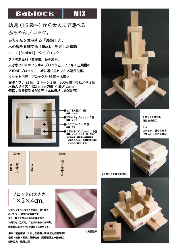 新生!Bablock MIX 創 2012年06月01日 2011年11月よりご愛顧頂いております「Bablock/ベイブロック」が仕様を新たに5月5日『こどもの日』に生まれ変わりました。ブナのベイブロックに、ヒノキの倍寸(200%)Bablockジャンボ、ヒノキ+広葉樹の2TONEブロックを含めた内容で、より一層遊びが広がります。もちろん一緒に遊べる木箱付き!詳細&お求めは下記サイトで。「関野絡繰堂HP - Bablock MIX」http://www.sdratm.jp/「関野絡繰堂NETSHOP」http://sekino.cart.fc2.com/ca10/18/p-r-s/原案:稲谷靖子(くらしき作陽大学 子ども教育学部)企画・制作・販売:関野倫宏(関野意匠室+絡繰堂)制作協力:遠行工房・・・追記:2012年6月10日KENBI CIFAKA(岡山県立美術館ショップ)にて「Bablock MIX」をお取り扱い頂いてます。「Creators Child Collection シファカのスタッフが選ぶ絵本とおもちゃのフェア」http://cifaka.jp/kenbi/archives/147人工芝の上で展示されていて、まるで素敵な廃墟(※)のような雰囲気♪ぜひ、岡山県立美術館にてご覧くださいませ。(※関野はお城や工場などの廃墟・廃屋が好きなんです^^)関野意匠室+絡繰堂HP/http://www.sdratm.jp/展覧会+ワークショップ情報/http://sdr.blog.shinobi.jp/Entry/98/常設展示・取り扱い店情報/http://sdr.blog.shinobi.jp/Entry/355/関野絡繰堂NETSHOP/http://sekino.cart.fc2.com/ 関野絡繰堂 公式HP/http://sdratm.jimdo.com/ 展覧会+ワークショップ情報/http://sdr.blog.shinobi.jp/Entry/98/ 関野絡繰堂Yahoo!店/ https://store.shopping.yahoo.co.jp/skdy/ 関野絡繰堂BASE店/ http://sdr.base.ec/ 関野絡繰堂minne店/ https://minne.com/sdr 関野絡繰堂Amazon店/ http://www.amazon.co.jp/(関野絡繰堂で検索) 関野絡繰堂Pinkoi店/ https://jp.pinkoi.com/store/sekino 関野絡繰堂メルカリ店/ https://mercari-shops.com/shops/rhPSvVgTw8RPBKCmLa4tTL 常設展示・取り扱い店情報/http://sdr.blog.shinobi.jp/Entry/355/ カラクリ 絡繰 オートマタ AUTOMATA 組木 ペットの振り子時計 PR http://sdr.blog.shinobi.jp/Entry/357/新生!Bablock MIX