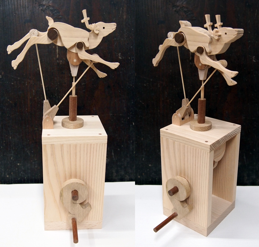 跳ねトナカイ 創 2013年11月05日 トナカイ人形は昨年のクリスマス用に製作したもの。 実に1年越しでオートマタに昇格。製作日数3日。笑しかし、クランクではなくカムで、小さな上下運動を大きく化けさせることに成功。自己ベストなカラクリに仕上がりました。価格:15,000円(税抜)2013年11月中のご予約分のみ、消費税・送料込12,800円で製作いたします。<予約受付中>メールフォームにてお問い合わせください。 関野絡繰堂 公式HP/http://sdratm.jimdo.com/ 展覧会+ワークショップ情報/http://sdr.blog.shinobi.jp/Entry/98/ 関野絡繰堂Yahoo!店/ https://store.shopping.yahoo.co.jp/skdy/ 関野絡繰堂BASE店/ http://sdr.base.ec/ 関野絡繰堂minne店/ https://minne.com/sdr 関野絡繰堂Amazon店/ http://www.amazon.co.jp/(関野絡繰堂で検索) 関野絡繰堂Pinkoi店/ https://jp.pinkoi.com/store/sekino 関野絡繰堂メルカリ店/ https://mercari-shops.com/shops/rhPSvVgTw8RPBKCmLa4tTL 常設展示・取り扱い店情報/http://sdr.blog.shinobi.jp/Entry/355/ カラクリ 絡繰 オートマタ AUTOMATA 組木 ペットの振り子時計 PR http://sdr.blog.shinobi.jp/Entry/419/跳ねトナカイ