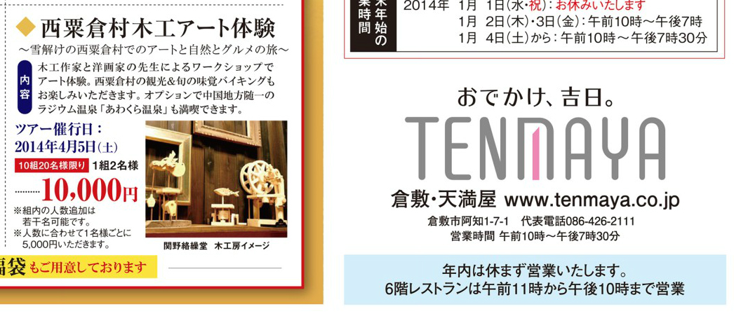 西粟倉 木工アート体験(バスツアー) 報 2013年12月25日 2013年12月26日付けの告知チラシの情報です。2014年1月5日現在、ひとまずの定員24名様の予約が入りました。とてもありがたいことです。なお、1月13日まで受付中、もし24名以上になった場合は現在の中型バスから大型バスに変更されるそうです。行程のアイデア協力もしております。関野家の油彩画アトリエ・木工房の見学ほか、西粟倉・森の学校(鹿肉カレーのランチ&日本酒BAR)、東粟倉おもちゃ村・黄金泉(いずれかを選択)、あわくらんど・・・など、西粟倉・旧東粟倉周辺を巡回予定です。<天満屋倉敷店 新春福袋企画>◆西粟倉村 木工アート体験 バスツアー お問合せ・ご予約は天満屋倉敷店にて受付中。お知らせフルバージョン(PDF)=天満屋倉敷店公式HPへのリンクhttp://www.tenmaya.co.jp/webchirashi/kurashiki/00283/index_00283.html#page=2 関野絡繰堂 公式HP/http://sdratm.jimdo.com/ 展覧会+ワークショップ情報/http://sdr.blog.shinobi.jp/Entry/98/ 関野絡繰堂Yahoo!店/ https://store.shopping.yahoo.co.jp/skdy/ 関野絡繰堂BASE店/ http://sdr.base.ec/ 関野絡繰堂minne店/ https://minne.com/sdr 関野絡繰堂Amazon店/ http://www.amazon.co.jp/(関野絡繰堂で検索) 関野絡繰堂Pinkoi店/ https://jp.pinkoi.com/store/sekino 関野絡繰堂メルカリ店/ https://mercari-shops.com/shops/rhPSvVgTw8RPBKCmLa4tTL 常設展示・取り扱い店情報/http://sdr.blog.shinobi.jp/Entry/355/ カラクリ 絡繰 オートマタ AUTOMATA 組木 ペットの振り子時計 PR http://sdr.blog.shinobi.jp/Entry/437/西粟倉 木工アート体験(バスツアー)