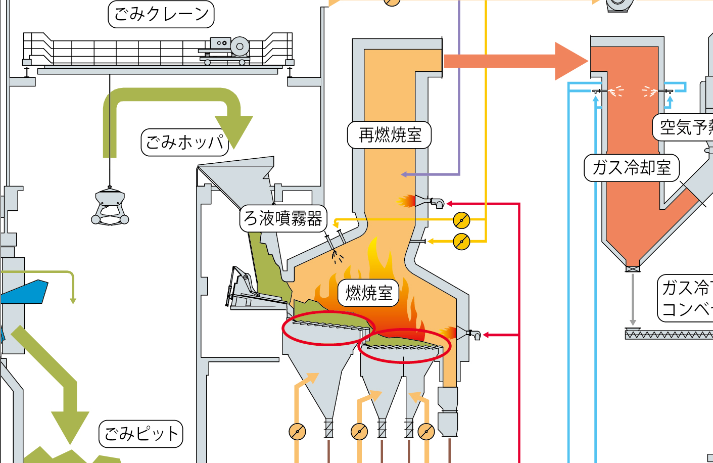 焼却炉内図:赤い楕円で示した部分の機構のミニチュアモデルです。