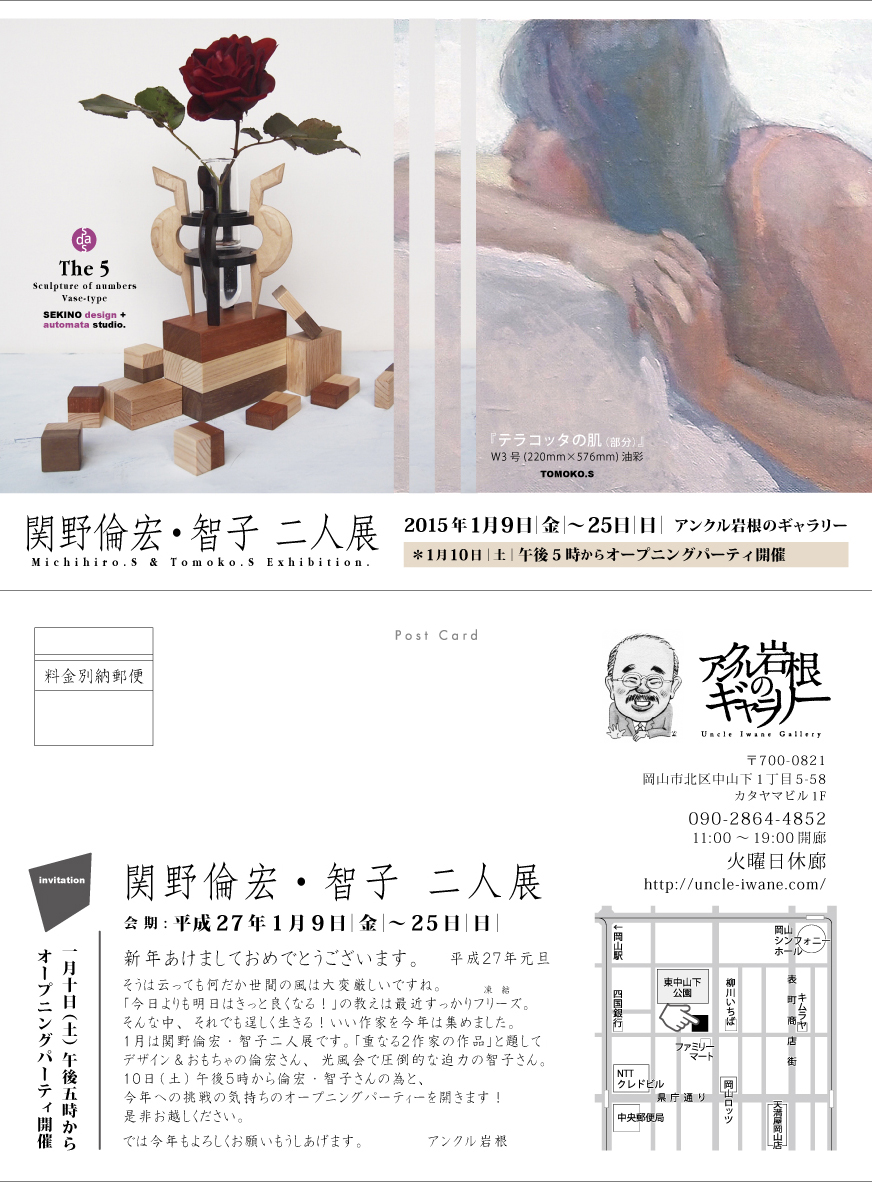 関野倫宏・智子二人展 報 2015年01月07日 関野倫宏・智子二人展 開催いたします。私、倫宏の出展作品は、昨年晩夏よりこの展覧会を目指して制作に取り掛かった「記号彫刻」や、これまでの創作品「絡繰 オートマタ」・「時計」などを網羅した内容といたします。期間を1月9日~16日、17日~25日の2部に分けて展示物を入れ替える予定です。ご高覧くださいませ。・・・「重なる2作家の作品」と題してデザイン&おもちゃの倫宏さん、光風会で圧倒的な迫力の智子さん。10日(土)午後5時から倫宏・智子さんの為と、今年への挑戦の気持ちのオープニングパーティーを開きます(アンクル岩根)〒700-0821 岡山市北区中山下1丁目5-58 カタヤマビル1F090-2864-485211:00~19:00開廊 火曜日休廊http://uncle-iwane.com/ 関野絡繰堂 公式HP/http://sdratm.jimdo.com/ 展覧会+ワークショップ情報/http://sdr.blog.shinobi.jp/Entry/98/ 関野絡繰堂Yahoo!店/ https://store.shopping.yahoo.co.jp/skdy/ 関野絡繰堂BASE店/ http://sdr.base.ec/ 関野絡繰堂minne店/ https://minne.com/sdr 関野絡繰堂Amazon店/ http://www.amazon.co.jp/(関野絡繰堂で検索) 関野絡繰堂Pinkoi店/ https://jp.pinkoi.com/store/sekino 関野絡繰堂メルカリ店/ https://mercari-shops.com/shops/rhPSvVgTw8RPBKCmLa4tTL 常設展示・取り扱い店情報/http://sdr.blog.shinobi.jp/Entry/355/ カラクリ 絡繰 オートマタ AUTOMATA 組木 ペットの振り子時計 PR http://sdr.blog.shinobi.jp/Entry/516/関野倫宏・智子二人展