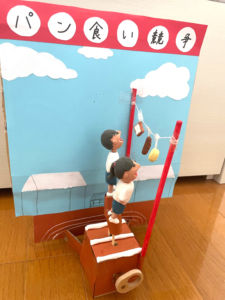 パン食い競争。ジオラマの白線やトラックの表現、テントなど。