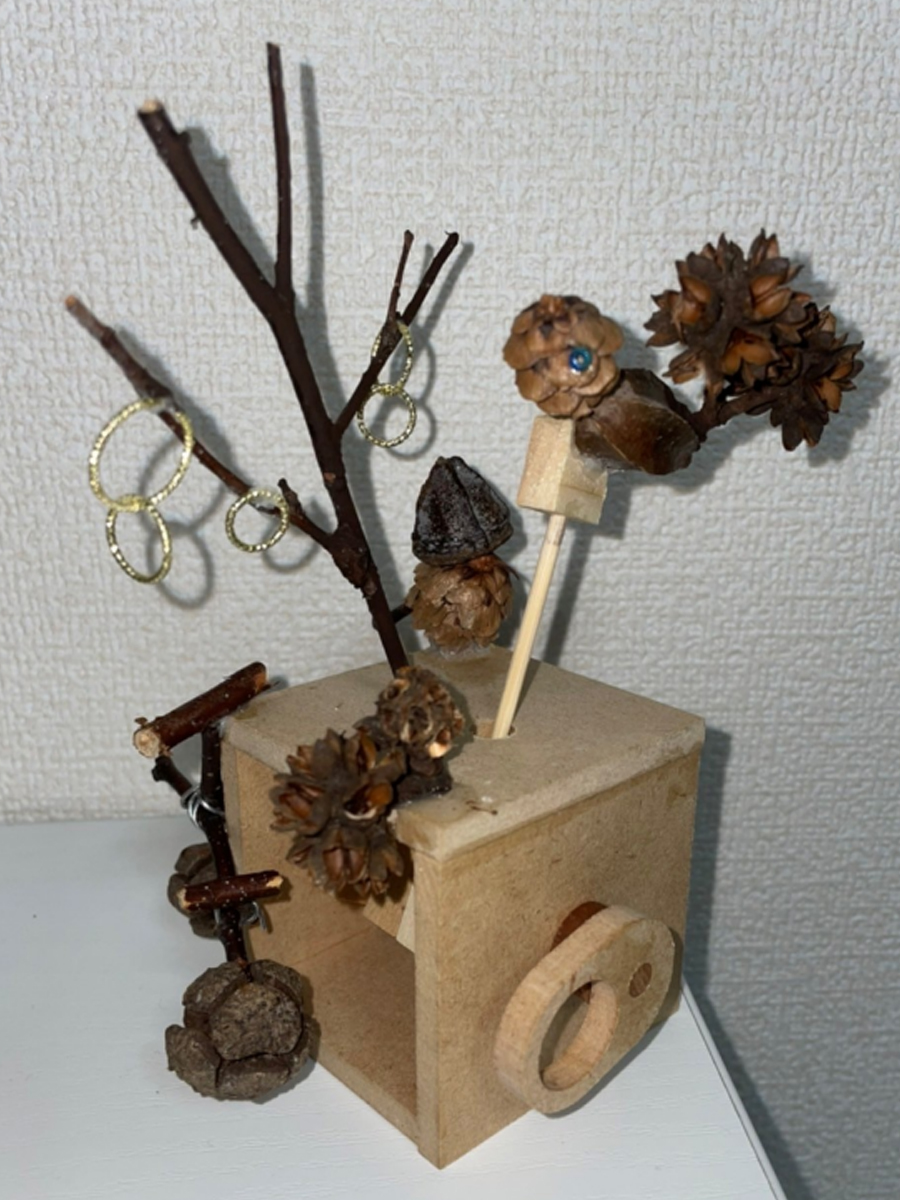 木の実などを使った森や樹の表現。抽象表現されたリスや人がいます。
