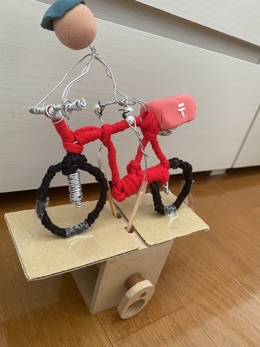 郵便配達の赤い自転車。針金で表現した配達員の脚の動きをクランクで表現。