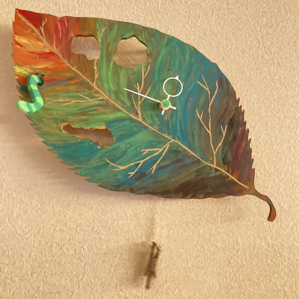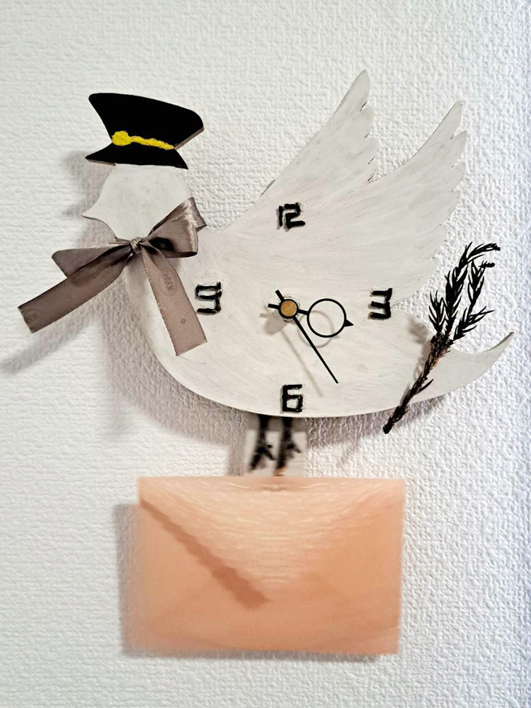 振り子を手紙にしたのはアナログ感を出す目的。脚は小枝で表現した可愛い作品。