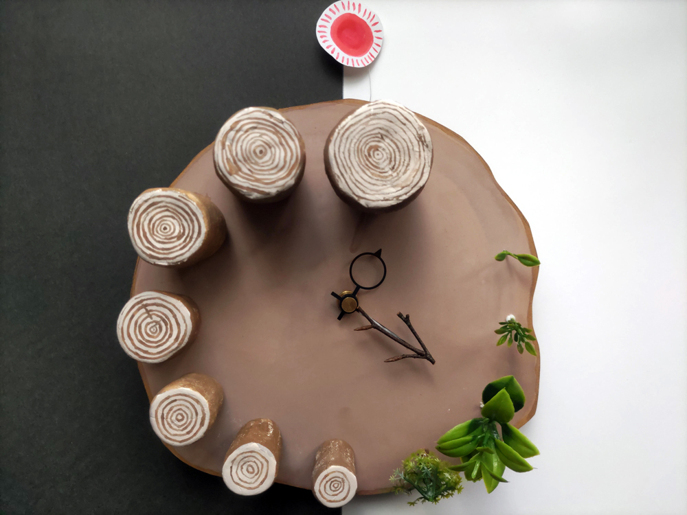 木の成長と時間を表現した時計。双葉から次第に年輪を重ね、