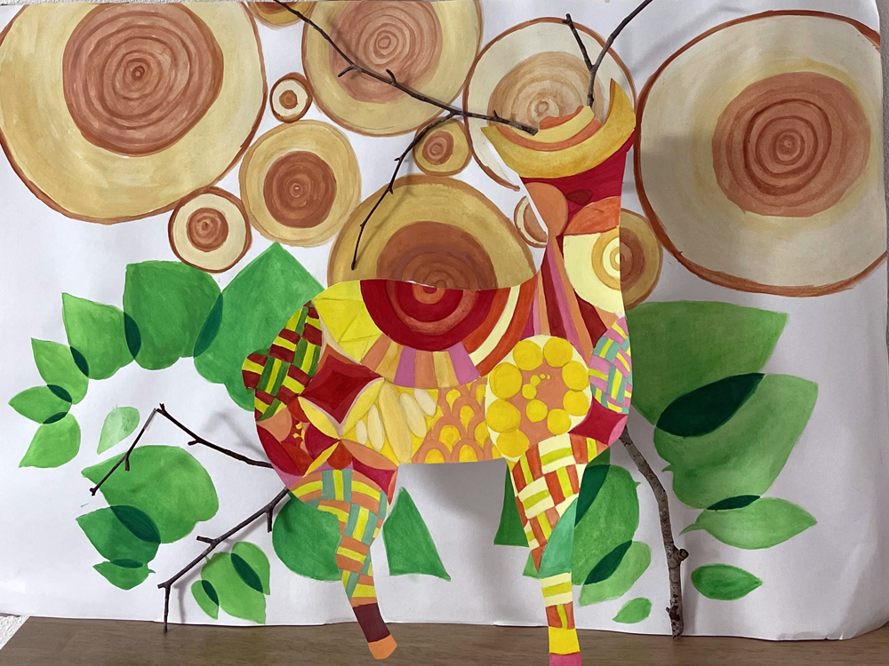 西粟倉村の特色「鹿と木材」を絵画作品として表現。