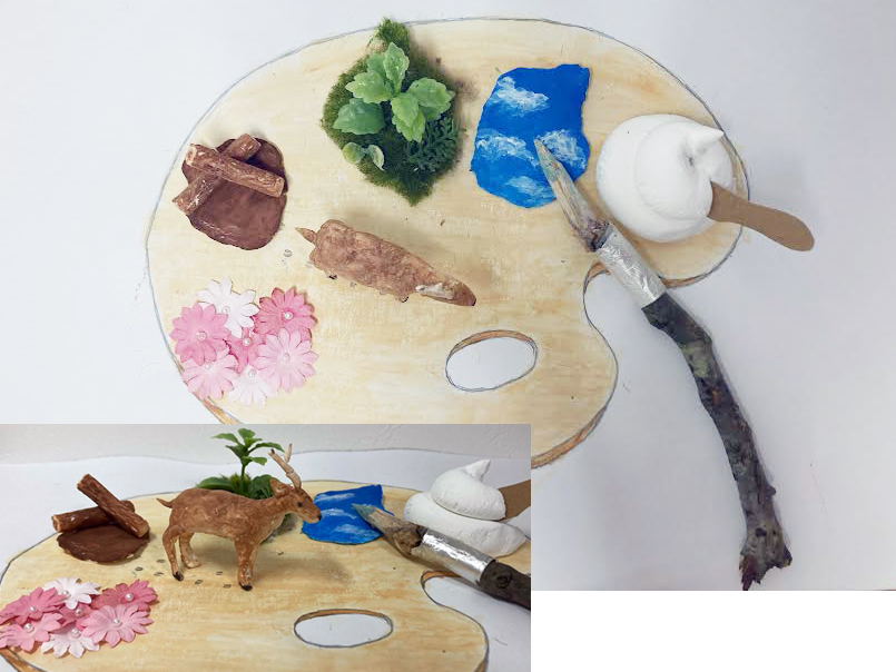 パレットの上に、5色の西粟倉村らしさを表現した立体絵画作品。