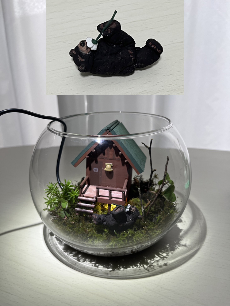宿泊したコテージを細かく再現。西粟倉村の木材などを使ったLED付テラリウム。