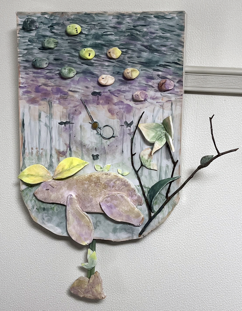 森の体験…クマ・鳥、草花・樹木を淡い水彩画のように表現した振り子時計作品。