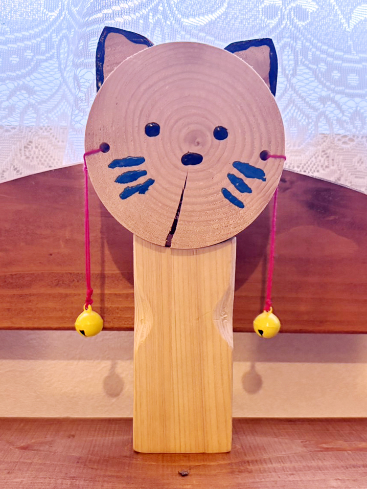 持ち手を握り、くるくる振ると鈴が鳴る仕掛け。ヤスリがけが丁寧な作品。