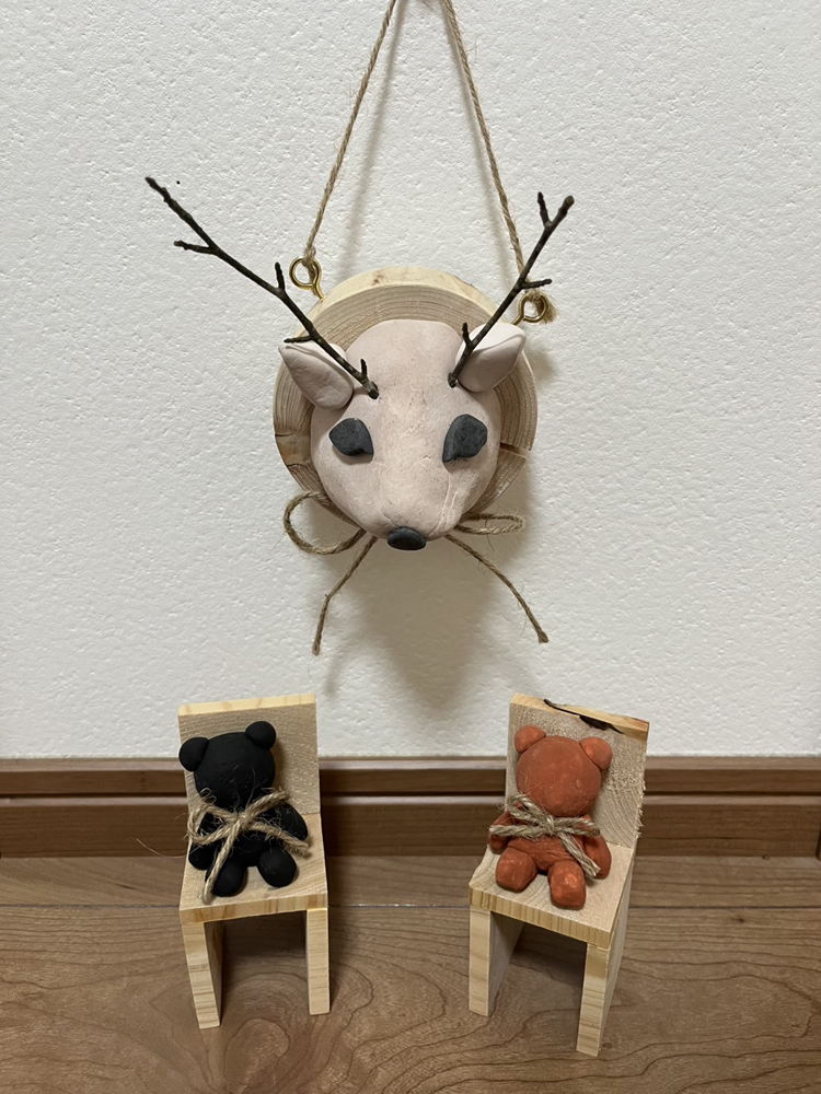 村内産材と紙粘土を使った人形飾り。枝を鹿の角に見立てリボンを結んでいます。