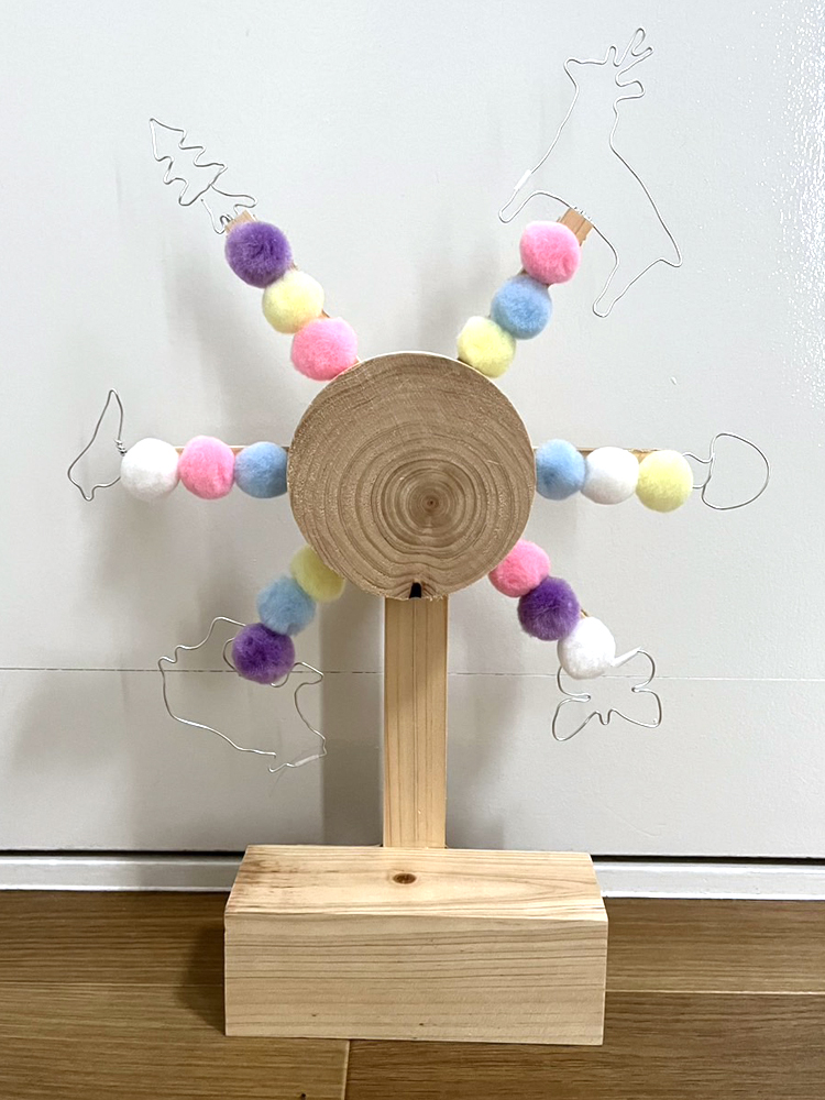 村内産材を使い、森林体験で得た森の情報、生き物たちを針金で表現した観覧車。