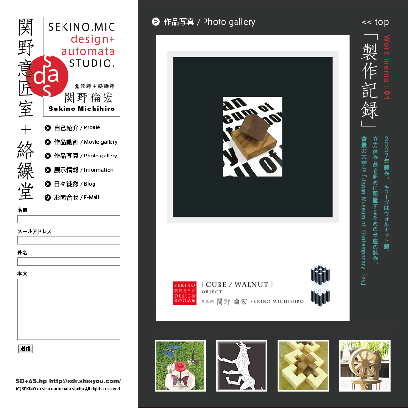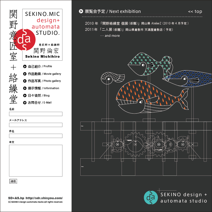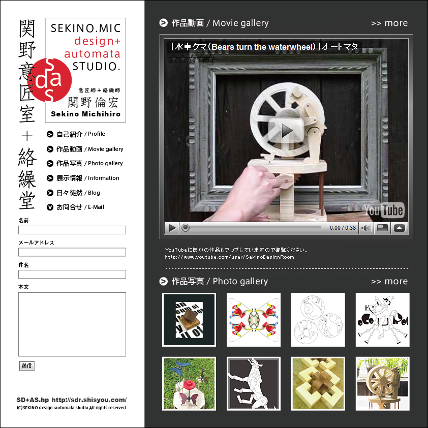 続・関野意匠室+絡繰堂HP 想 2009年09月08日 先ほど、ひとまずの完成をいたしました。 ・HPトップ http://sdr.shisyou.com/・自己紹介 http://sdr.shisyou.com/profile/・作品動画 http://www.youtube.com/user/SekinoDesignRoom・作品写真 http://sdr.shisyou.com/gallery/・展示情報 http://sdr.shisyou.com/info/・日々徒然 http://sdr.blog.shinobi.jp/以上がリンク先アドレスになってます。なお、「ギャラリー」では、月イチで過去の作品の写真1点と作品メモを紹介していきます。※「日々徒然」は、ご覧いただいているブログです。 関野絡繰堂 公式HP/http://sdratm.jimdo.com/ 展覧会+ワークショップ情報/http://sdr.blog.shinobi.jp/Entry/98/ 関野絡繰堂Yahoo!店/ https://store.shopping.yahoo.co.jp/skdy/ 関野絡繰堂BASE店/ http://sdr.base.ec/ 関野絡繰堂minne店/ https://minne.com/sdr 関野絡繰堂Amazon店/ http://www.amazon.co.jp/(関野絡繰堂で検索) 関野絡繰堂Pinkoi店/ https://jp.pinkoi.com/store/sekino 関野絡繰堂メルカリ店/ https://mercari-shops.com/shops/rhPSvVgTw8RPBKCmLa4tTL 常設展示・取り扱い店情報/http://sdr.blog.shinobi.jp/Entry/355/ カラクリ 絡繰 オートマタ AUTOMATA 組木 ペットの振り子時計 PR http://sdr.blog.shinobi.jp/Entry/75/続・関野意匠室+絡繰堂HP