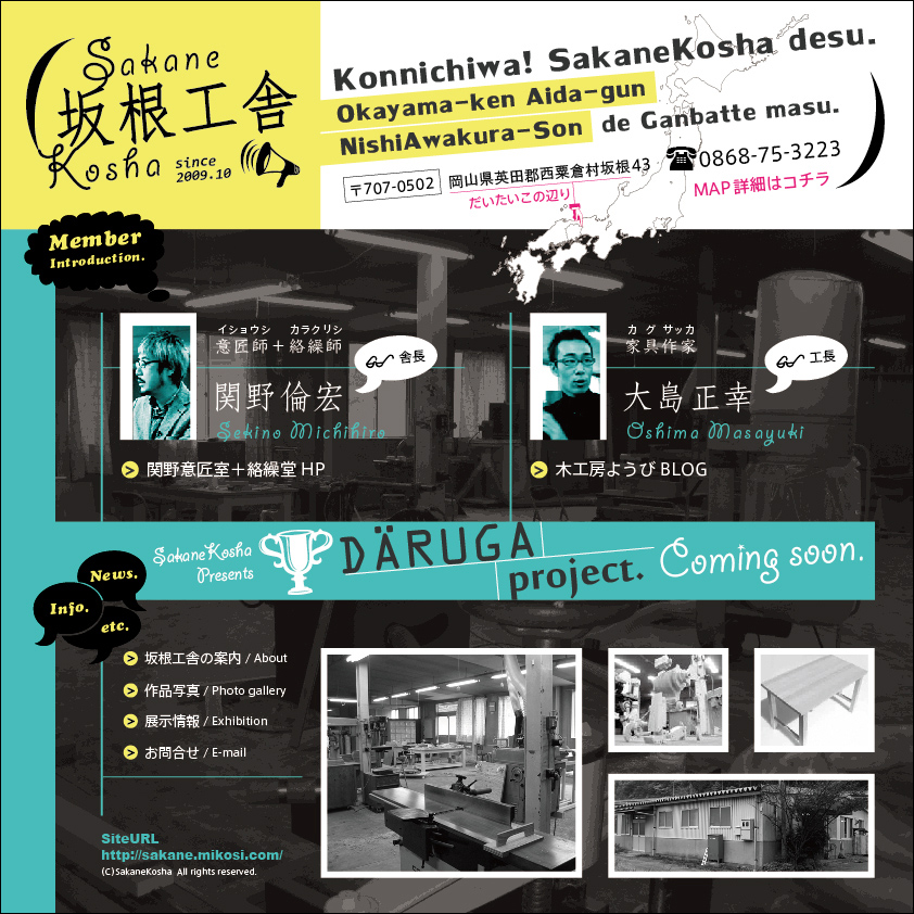 坂根工舎の案内/About 創 2009年11月11日 2009年11月11日、かつて制作したHP意匠。※関野が独立した2010年に本HPは削除しています。展覧会+ワークショップ情報/Exhibition+W.S. スケジュールhttp://sdr.blog.shinobi.jp/Entry/98/関野絡繰堂NETSHOP/関野意匠室+絡繰堂のオンラインショップhttp://sekino.cart.fc2.com/関野意匠室+絡繰堂HP/オフィシャル・ホームページhttp://www.sdratm.jp/ 関野絡繰堂 公式HP/http://sdratm.jimdo.com/ 展覧会+ワークショップ情報/http://sdr.blog.shinobi.jp/Entry/98/ 関野絡繰堂Yahoo!店/ https://store.shopping.yahoo.co.jp/skdy/ 関野絡繰堂BASE店/ http://sdr.base.ec/ 関野絡繰堂minne店/ https://minne.com/sdr 関野絡繰堂Amazon店/ http://www.amazon.co.jp/(関野絡繰堂で検索) 関野絡繰堂Pinkoi店/ https://jp.pinkoi.com/store/sekino 関野絡繰堂メルカリ店/ https://mercari-shops.com/shops/rhPSvVgTw8RPBKCmLa4tTL 常設展示・取り扱い店情報/http://sdr.blog.shinobi.jp/Entry/355/ カラクリ 絡繰 オートマタ AUTOMATA 組木 ペットの振り子時計 PR http://sdr.blog.shinobi.jp/Entry/95/坂根工舎の案内/About