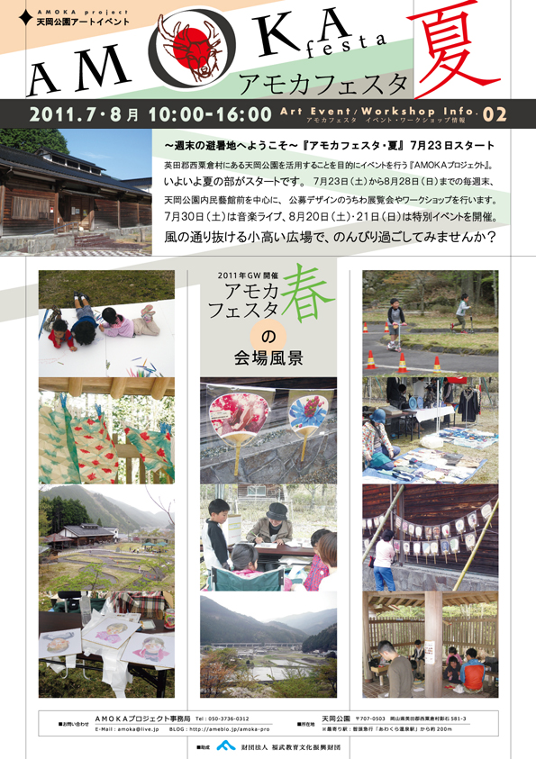 AMOKAフェスタ夏!フライヤー 報 2011年07月03日 ~週末の避暑地へようこそ~『アモカフェスタ・夏』7月23日スタート英田郡西粟倉村にある天岡公園を活用することを目的にイベントを行う『AMOKAプロジェクト』。いよいよ夏の部がスタートです。7月23日(土)から8月28日(日)までの毎週末、天岡公園内民藝館前を中心に、公募デザインのうちわ展覧会やワークショップを行います。7月30日(土)は音楽ライブ、8月20日(土)・21日(日)は特別イベントを開催。風の通り抜ける小高い広場で、のんびり過ごしてみませんか?・・・「~関野倫宏・智子作品展~ 森に遊ぶ 絡繰+絵画」http://sdr.blog.shinobi.jp/Entry/253/展覧会+ワークショップ情報/Exhibition+W.S. スケジュールhttp://sdr.blog.shinobi.jp/Entry/98/関野倫宏プロフィール/岡山県美術家協会 美術家マップhttp://www.opaa.jp/members/716.htmlAMOKAプロジェクトBLOGhttp://ameblo.jp/amoka-pro 関野絡繰堂 公式HP/http://sdratm.jimdo.com/ 展覧会+ワークショップ情報/http://sdr.blog.shinobi.jp/Entry/98/ 関野絡繰堂Yahoo!店/ https://store.shopping.yahoo.co.jp/skdy/ 関野絡繰堂BASE店/ http://sdr.base.ec/ 関野絡繰堂minne店/ https://minne.com/sdr 関野絡繰堂Amazon店/ http://www.amazon.co.jp/(関野絡繰堂で検索) 関野絡繰堂Pinkoi店/ https://jp.pinkoi.com/store/sekino 関野絡繰堂メルカリ店/ https://mercari-shops.com/shops/rhPSvVgTw8RPBKCmLa4tTL 常設展示・取り扱い店情報/http://sdr.blog.shinobi.jp/Entry/355/ カラクリ 絡繰 オートマタ AUTOMATA 組木 ペットの振り子時計 PR http://sdr.blog.shinobi.jp/Entry/264/AMOKAフェスタ夏!フライヤー